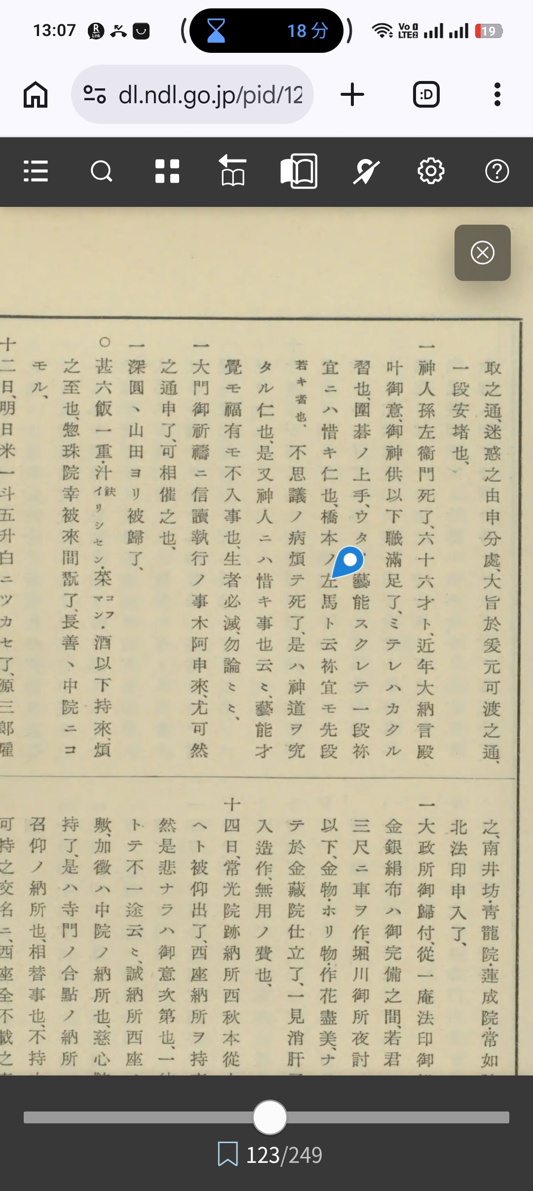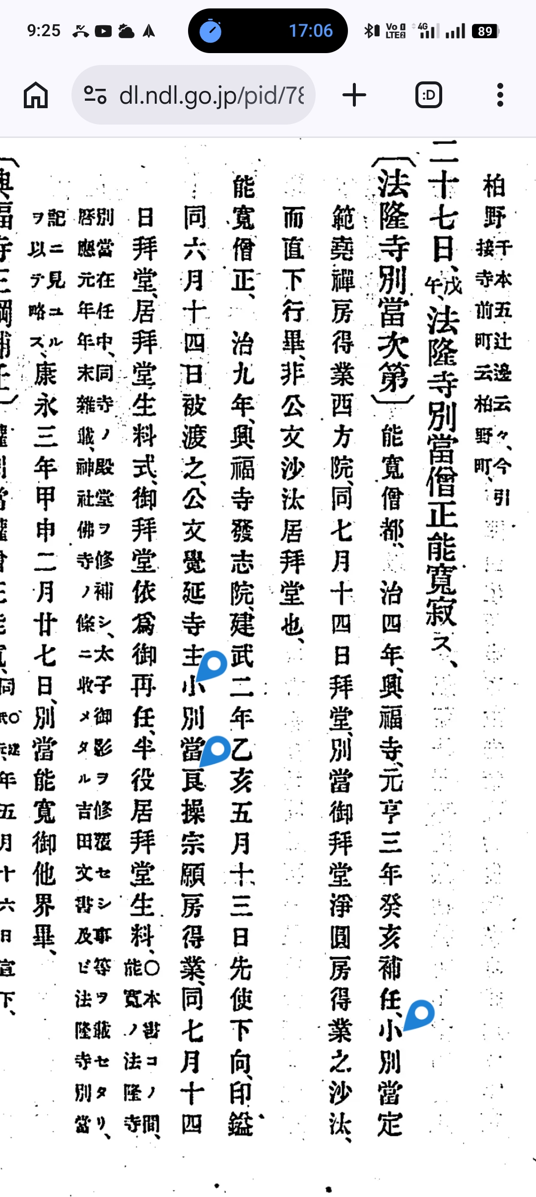 多聞院日記 第3巻(125項、国会図書館デジタルコレクション有り、著者英俊 著 [他]請求記号210.48-E38t-Tk、国会図書館へ)より引用→ 天正八年九月 十四日、談義了、海如上洛了、 十五日、大乗院祈禱在之、不出、屋二一宿了、 十六日、談義了、科文廿卷新調伊与二申付、方々へ買了、代一卷二八升ツ、也、今度ノ興隆祈禱第一也、 十七日、金藏院四季講師沙汰之來題第二定出苦、講師西ハシノヰン、 一上コン又預ヶ物來了、 十八日、曉夢ニ、大鳥井ノ前ヲ坊へ歸レハ、ヌリコシニノリテ、四人シテカキテ、扶院ノロへ入了、跡ョリ行へ、東ノクラノ木ノ門ニシテ、瓦ツシヌリテキレキニシテアリ、入テョリ明星院ノ門ノアタリニテ愚身ノ裝束ノ念珠箱アリ、何トシテアルソ、不審ニテ拾テ持處三、水精ノス、ノ玉、イカホトモアルヲ拾集テ、右ノ袂二入、ソハニ小性アリ、舜學房ノ者也只今コシニテ歸リシへ、吉祥院カト尋レハ常如院也、コヨヰ屋ニテ死ナレ申、兼テ腹痛キヨシマテニテ、何トナク死ナレ申ヲ、タ、イマ坊へトリテ歸ト申ト慥二見テ夢覺レハ、七ノ鐘ナル、アサマシクテアマリ慥ナレハ、夢違シテ如此書置之、 一一乘院大般若談義、取亂間不參、長賢房、參了、 一從大門様ツホノロ被切トテ、無上一器被下了、 一從大門様ツホノロ被切トテ、無上一器被下了、忝事也、今夕ョリ社頭二二夜三日御參籠ノ由也、談義在之、 十九日談義沙汰之專千代神事トテ下了、