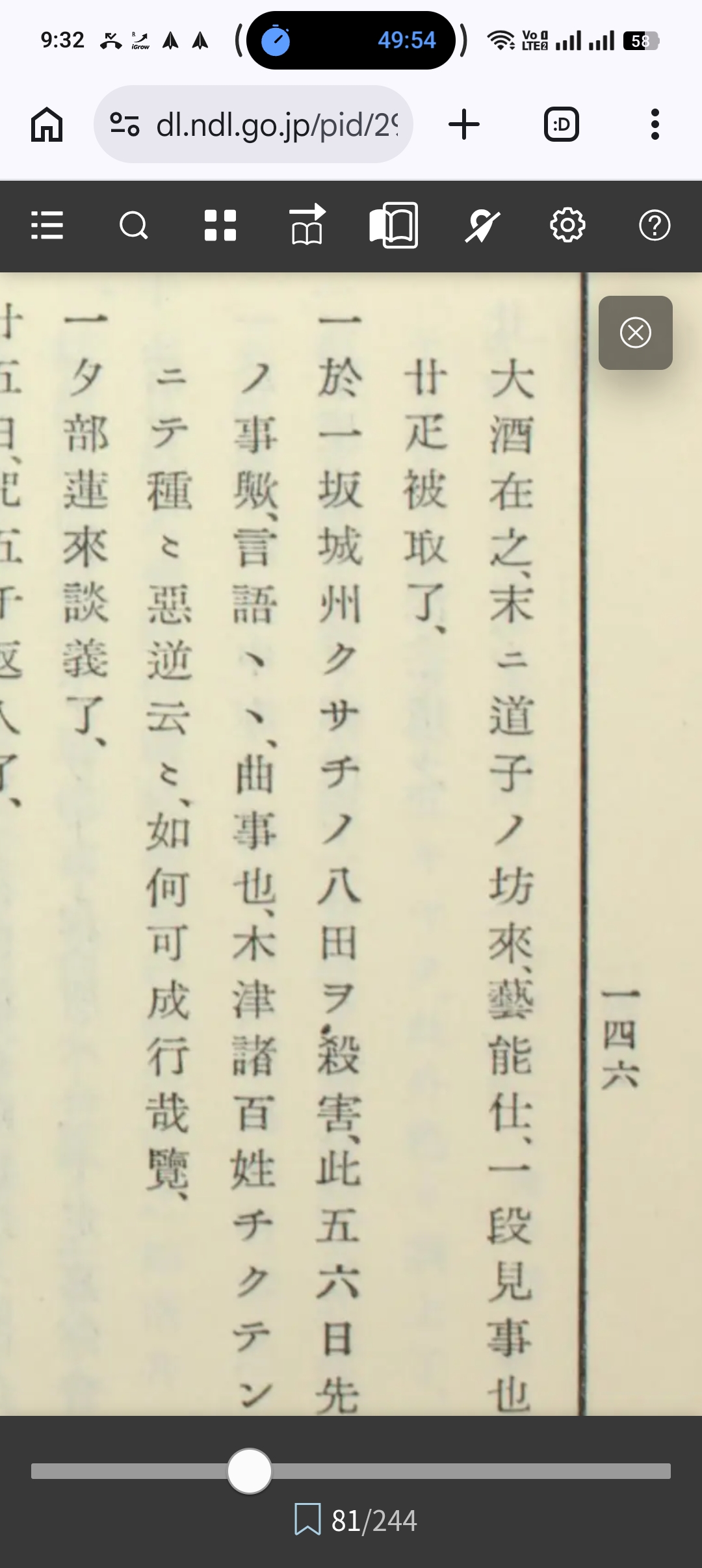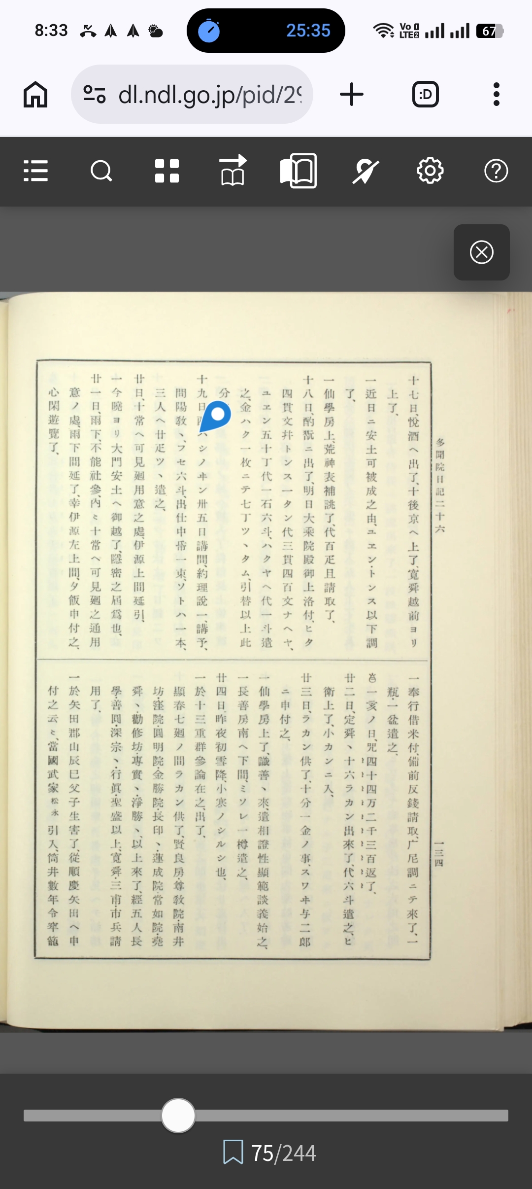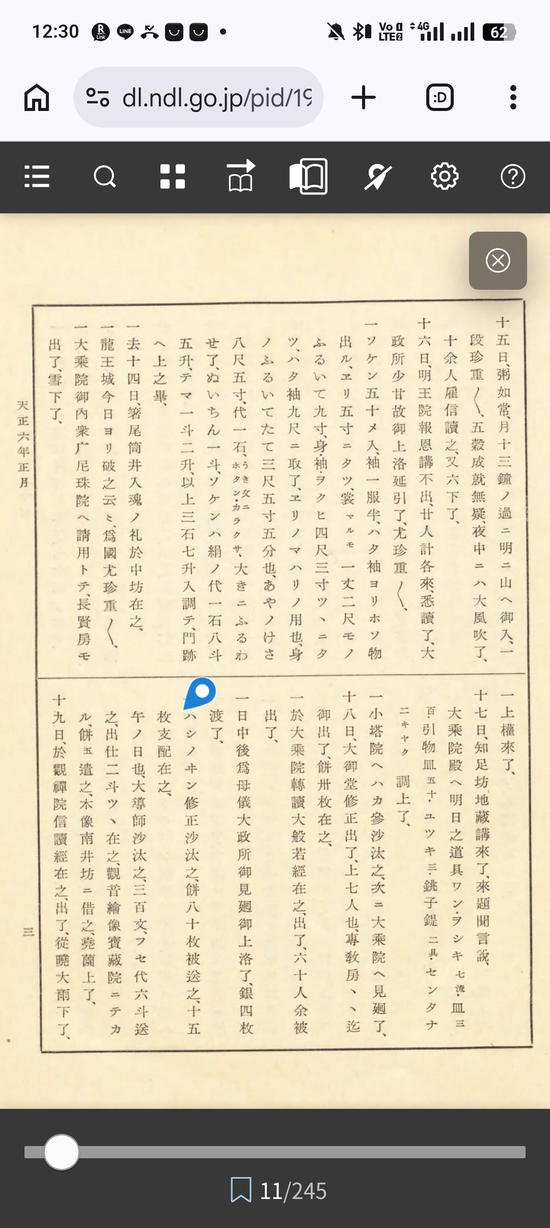 多聞院日記 第3巻(35項、国会図書館デジタルコレクション有り、著者英俊 著 [他]請求記号210.48-E38t-Tk、国会図書館へ)より引用→ 天正六年十一月 十八日、攝末歸本談義了、燒餅一籠蓮坊ョリ來、吉村正左衛門卅疋持來了、 一御供米藏付二一石五斗程上之、 十九日、吉正へマンチウ十・大根遣之、仙學房明日下了、談義今日迄也、馬廿日今曉夢二、社頭但馬屋ノアタリニテ、夜子タル上クツレカ、ル、既ニ死ト思ヒシニクルシカラス、見レハ大ノ蛇ヘンミノ様ナルカ先へ行ハ、アトヨリクロクアヲキ長一丈余アルカヲウテュク、大木へ上ルヲ見レへ足アリ、ソハナル物二蛇ノ足ノ爪ヲ見レへ利生也トテイタ、ク、見二爪大キニアリト見テ夢覺了、 廿一日、社參了、二条殿御煩、咬止~~、西ハシノ院觀禪院見廻了、德政口遊在之、 廿二日、雨下了、一乗院殿ヨリヒワタへ被申入云 廿三日、ハシノ坊雇テ新五郎小袖仕立了、升、糸クキモノチンマテ合三石一斗ノ入目也、 一近日奇破ノ口遊在之、沈思~と、 廿四日、祭礼赤飯ノ用米ッキ了、小豆ソロヱ釜トヌリ用意了、卵、 廿五日、先夜夢ニ兵庫ノ南ト思、又、大安寺ノ當歟ニテ、大池西東北へ、白蓮花アマタ既ニ開テ、散カ、リタルト、今ツホメル靑ト數多マシリタルヲ見、蹺起テ見レハ白ク雪下了、一日雨下、入夜マテ不止、 一赤飯三石觀禪院へ大ヨリ直被遣之、二石西ハシノキンヘノ内、且一石是ヨリ今日遣之、大會方報答也、觀禪院へ笛/笠加增二被遣之、千手院仕立也、合二石五斗程入、ソケヰ官人ノ所、風流一段見事也、色、機遣之處、心安こと、西ハシノキンヘハ二百疋ヒ夕加増遣之、コレヨリ遣之、 一觀禪院へ新五郎上下著遣之、予供目代ノ時ノ下司ヨリ田ロ事申上了、當坊平茸四ク、リ取テ 一亥ノ子友光ヨリ來、平茸少在之、 一星懃行先始之、相讚不審難副、如此習得未定、 説明
