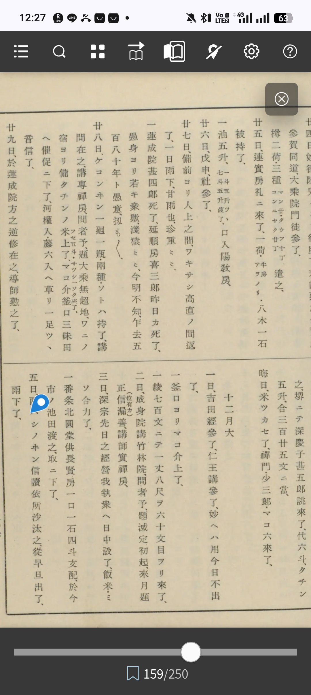 多聞院日記 第2巻(巻12-巻23)(271項、国会図書館デジタルコレクション有り、著者 英俊 [等著] [他]請求記号640-324、国会図書館へ)より引用→ 元亀二年十二月 廿五日 陽敎房へ日中雖有請、取亂間不出、明日ヨリ大般若發願付本尊以下用意、 一サッマヤ申事、孫令他出先延引了、 一晚竹來、如形之儀、無念ここ、 廿六日 於一切經御廊信讀大般若經卷不定發願、刁ノ剋ニ坊ョリ參詣テ始之、於神前五卷讀之、 一同剋ニ長賢房モ發願了、一人シテ八是初也、 一唯識講米夏季分、依路次義通於横田庄廿四日ヨリ今日迄三ヶ日ノ間ニ曳之、予、別義金剛之、則請ニ遣了、 廿七日 下蒻分蜂起在之、堂家ノ二諦坊愛染院一生不免罪科了、亂行ノ故也云こ、 廿八日 荒神社參、陽教房同道了、 廿九日 天氣快然、祝二諸方へ出了、 一瓦屋參籠長賢、、同上荷物入之、以之外造作也、 一成身院へ歲末二炭一荷雖遣之被返口 一佛前餅以下如例年、
