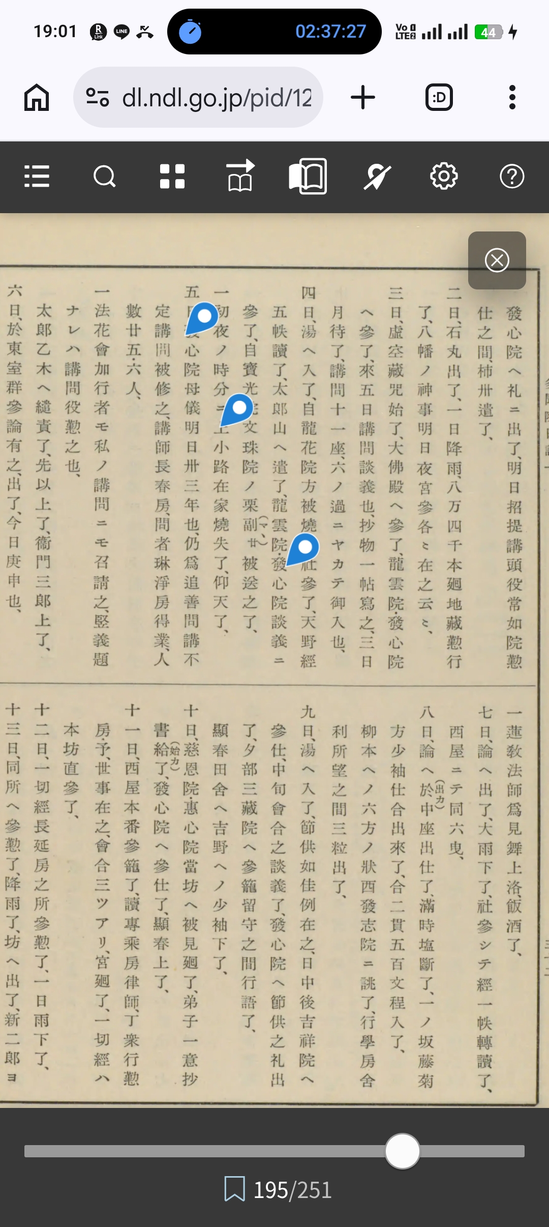 多聞院日記 第1巻(巻1至11)(375項、国会図書館デジタルコレクション有り、出版年月日昭和10請求記号640-324、国会図書館のページへ )より引用→天文十五年十月 一名田毛見在之、顯春上了、 一夕部勝舜房堅義丁聞了、精義發心院、大悲闡提篇目如形之儀也、楞伽法樞要ノ尺ノ料簡そと在之、 心五百卷、 五日、天氣快然、東室堯香房出立所へ參了、樽一か遣了、 一古市足輕衆寄テ茶や共燒、 一左介方へ綿一把遣、且代三十文來了、湯入了、 心三百卷、 六日、福生院出立所東室へ出了、夕部長柄殿田舍へ被下了 心三百卅卷, 七日、妙音院井源五郎賴支在之、懸候、太郎山へ遣 心三百五十卷、 八日、塩斷了、口院參處ニ、明恵ノ御筆跡トテ大明神御名三國異也、發心院へ礼ニ出了、明日招提講頭役常如院懃仕之間、柿卅遣了、 二日、石丸出了、一日降雨、八万四千本廻地藏懃行了、八幡ノ神事明日夜宮參各在之云、 三日、虛空藏咒始了、大佛殿へ參了、龍雲院發心院へ參了、來五日講問談義也、抄物一帖寫之、三日月待了、講問十一座、六ノ過ニヤカテ御入也、 四日、湯へ入了、自龍花院方被燒之社參了、天野經五帙讀了太郎山へ遣了、龍雲院發心院談義ニ多了、自寶光院文珠院ノ栗歌、被送之了、 一初夜ノ時分ニ上小路在家燒失了、仰天了, 五日、發心院母儀明日卅三年也仍爲追善問講不定講開被修之、講師長春房、問者琳淨房得業、人數廿五、六人、 一法花會加行者モ私ノ講問ニモ召請之、堅義題ナレハ講問役懃之也、 太郎乙木へ譴責了、先以上了、衛門三郎上了、 六日、於東室群參論有之、出了、今日庚申也、 一蓮教法師爲見舞上洛、飯酒了、 七日、論へ出了、大雨下了、社參シテ經一帙轉讀了、西屋ニテ同六曳、 八日、論へ於中座出仕了、滿時塩斷了、一ノ坂藤菊方少袖仕合出來了、合二貫五百文程入了、柳本へノ六方ノ狀西發志院ニ謎了行學房舍利所望之間三粒出了、 九日、湯へ入了、節供如佳例在之、日中後吉祥院へ參仕、中旬會合之談義了、發心院へ節供之礼出礼出了、夕部三藏院へ參籠留守之間行語了、顯春田舎へ吉野へノ少袖下了、 十日、慈恩院·惠心院當坊へ被見廻了、弟子一意抄書給了、發心院へ參仕了、顯春上了、 十一日、西屋本番參籠了、讀專乘房律師、丁衆行懃房・予、世事在之、會合三ツアリ、宮廻了、一切經へ本坊直參了、 十二日、一切經長延房之所參懃了、一日雨下了、 十三日、同所へ參觀了、降雨了、坊へ出了、新二郎ョリ松露一盆來了、發心院へ參了、 十四日、發心院へ之所一切經參懃了、持寶院·常如院・窪院・淨ルリ院坊へ被見廻了酒以下在之、 一六方集會有之間出仕了、柳本以下之儀祝著了 十五日、明日會合引上今日在之、一切經出了、 十六日、同所へ出仕了、讀師講申了、 十七日、同所へ出了、結願有之、導師長堯房擬講、唄宮內卿擬講、散花春乘房、 十八日、報恩講知足坊ニテ春恩房依處出仕了、 一太郎丸田舍へ下了、月待了、卅三座懃了, 一內山尺迦院來了、雜帋三束持了、 十九日、寶光院四季講へ出了、來季題定通無差、講師春乘房也、性圓房始而出仕、 一昨日於攝州有大合戰、左右ニ人數巨多討死云と 廿日、魔界廻向等在之社參了、愛染咒十万返勸唱滿了、 廿一日、退出了、琳禪房春日講へ出了、來月題非自性善、來月地藏講、約入佛法、一日雨下了、 一昨日廿日之曉、森本藤二郎・同中務同子喜三林觀以下爲沙汰、藤勝房同道シテ何方となく落行了、言悟道斷曲事不可說之也、依之昨夕及晚柳本豐田以下曖ニテ、殘ノ衆・高柳殿与力衆各々・田中兄弟以下人數五百計ニテ柳本へ退城了、無念被成下不及言慮者也、始末如何可成行共不知、天運盡限何依愛、可任存、 一順昭も近般以外冠落もかさ之煩歟云と、 廿二日、田舎へ下了、藤勝殿、吉野菊屋被落付了、十市殿諸毛見沙汰サセ了、 廿三日、釜口迄歸了、 廿四日、先我等上了、顯春留置了、 一菅原今曉順昭ヨリ人數被遣被燒拂了、明日五、越智多武峯鄉へ被取懸云、人數少、南脇へ打寄云、 廿五日、信讀ノ仁王講在之、闕請始テ來ル間參懃了、同時退散以外嚴儀也、文珠咒勸進以下合十來廿六日自常如院問講不定觸了、題講衆廿五人、慈父卅三年也云と、 十四日、朗詠讀始了、宗乘房汁被設了、發心院古迹談義付了、 十五日、月數寄如例、大隨求クラニノ逆修於福聚院在之、出了、經十七把頓寫了、一日深雨、 十六日、經羅漢供如例、古迹談義付了、 一自明舜房補忘抄八帖被借上了、 一同學抄修補仕始了、 十七日、古迹談義參了、第七卷興基抄書始了、心經五百廿卷、都合也、十八日、當坊五師參賀沙汰了、日記二委細注之、一月待了、講問卅三座訖、源三郎上候間、成就院へ柳本庄入地可落之間申屆了、 一多聞講沙汰之, 一科文聞書書始了、 十九日、佛地院衆井三藏院爲五師祝音樽被持來了 廿日、古迹丁聞了、略同學抄少書寫了、 廿一日、社參了、寺內參了、雖參發心院、談義無之、 一彼岸二入了、持齋了、專恩房舍利所望之間、三粒遣了、 一昨日廿日 竹內城工十市衆取懸仕損了、少南平三井坂ノ市ノ