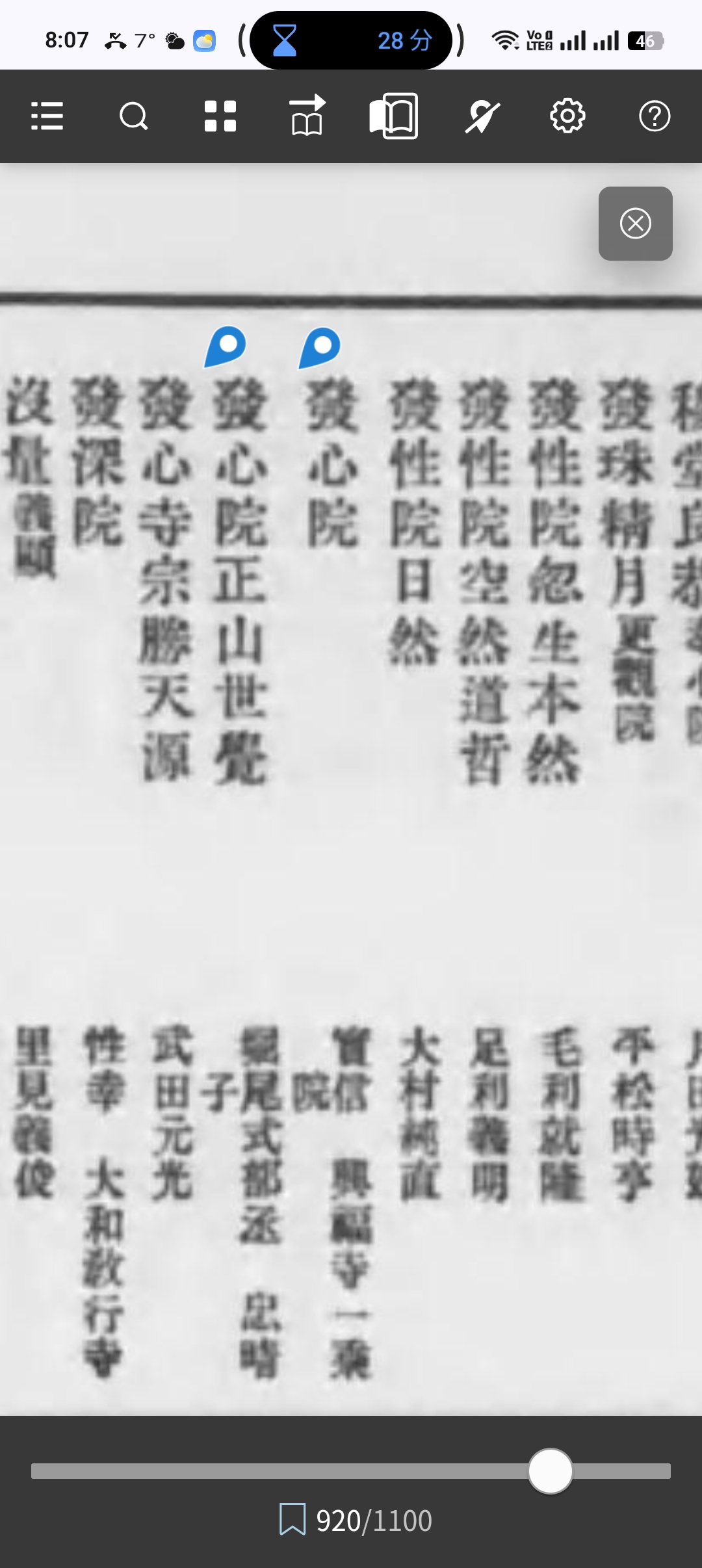 多聞院日記 第3巻(146項、国会図書館デジタルコレクション有り、著者英俊 著 [他]請求記号210.48-E38t-Tk、国会図書館へ)より引用→天正九年二月 廿四日、社參了、金藏院講問出了、來題謂起證實、講師願春房、、、 一長賢房母腹煩由申上、老者無心元者也、 一於阿弥陀院逆修坊修正在之、出了、神名帳唄役懃之、餅卅三枚在之、時導師摩尼珠院、大導師續別會妙德院、五師一人未補ノ處、南井坊請定了、大酒在之、末道子ノ坊來、藝能仕、一段見事也廿疋被取了、 一於一坂城州クサチノ八田ヲ殺害、此五六日先ノ事殿、言語、、、曲事也、木津諸百姓チクテンニテ種、悪逆云~、如何可成行哉覽、 一夕部蓮來談義了、 廿五日、咒五千返入了、 一西ハシノキン百ヶ日出、講禪舜、、問者予、題眞如無爲假實、捧物六斗、出仕雜帋一束、從夜中大雪之間輿ニテ出、 一從廿三日至今日恒例仁王講在之、諸方年玉返沙汰之、 廿六日、社參、屋二一日經讀了、一乗院祈禱在之、不出、 一於金堂二方會,經在之、當方第五日目五百內十帙、上十人參、一帙ツ、也、長善出テ一帙轉讀了、六方十帙宛也、本方ョリ始之也、佛灯、方ノ 一﨟ヨリ毎日出之、 一食堂陀ラ尼王在之尊勝ノ曼陀ラ新調云と、